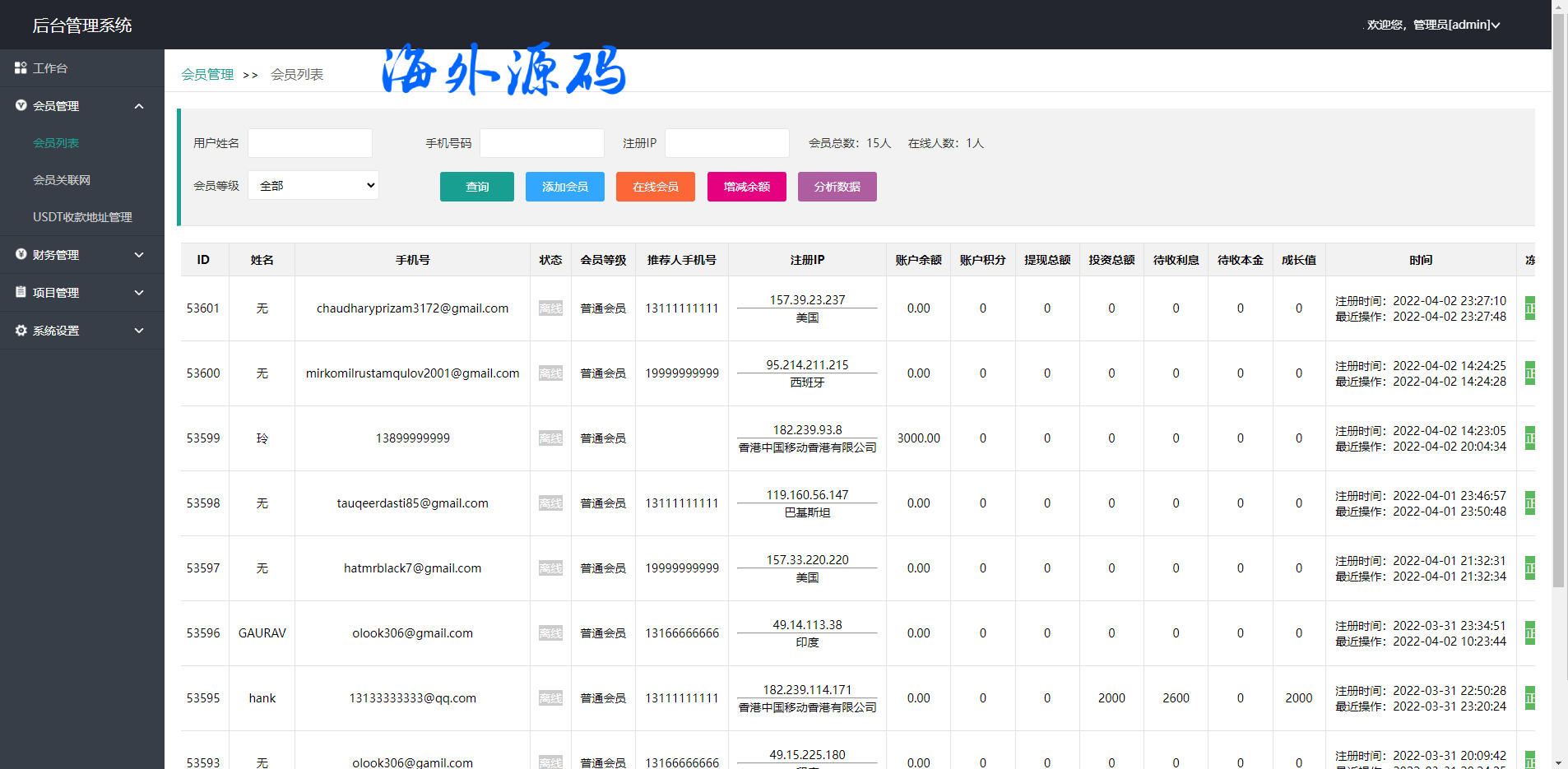 此套是以前客户运营下来的海外投资系统,前端产品可更改