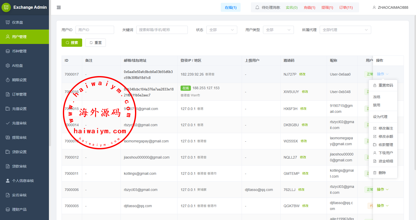 功能支持:合约,期权,贷款,理财,实名认证,权限代理,AI控盘等功能