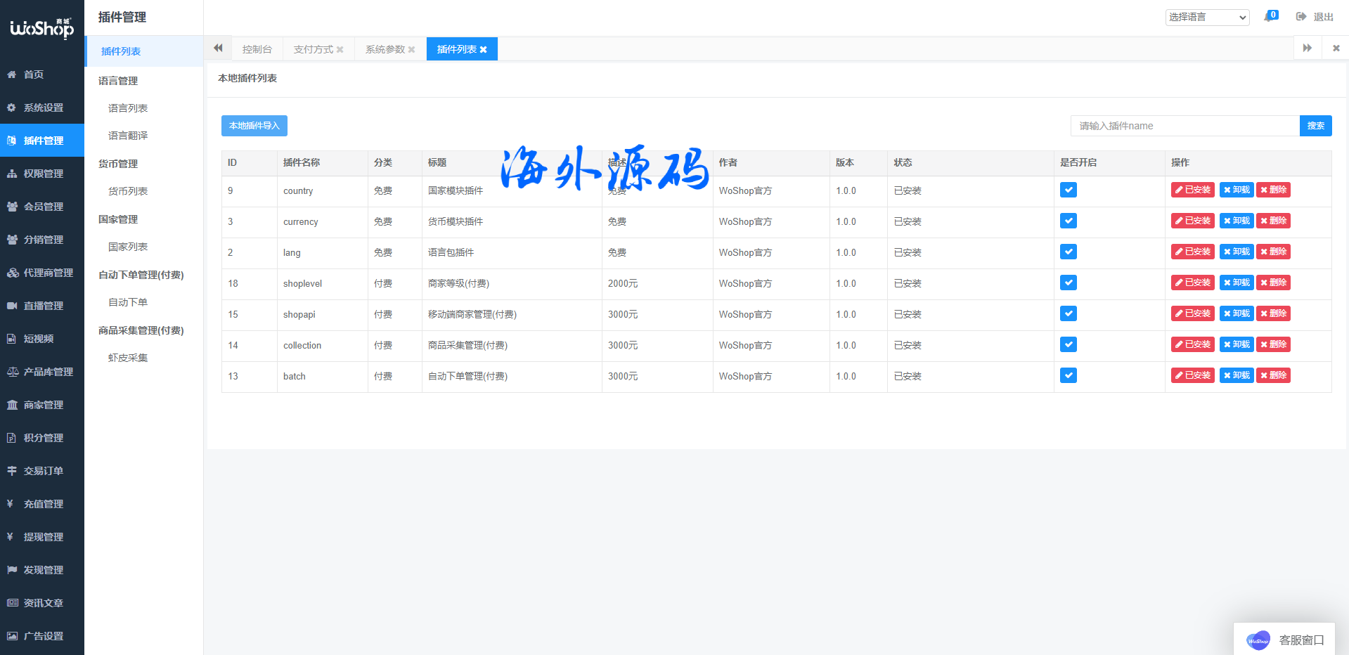 此套是是最新的全套WoShop多商户跨境电商系统,附带付费插件