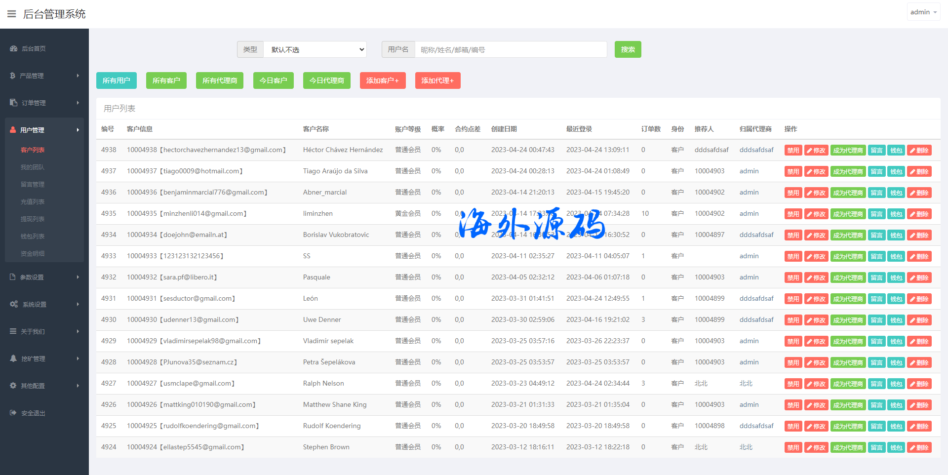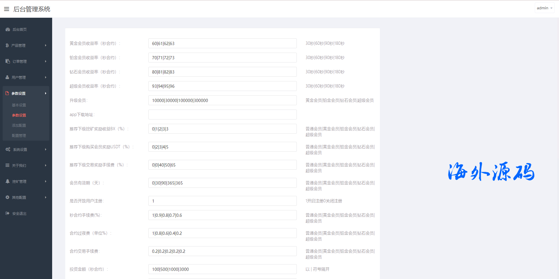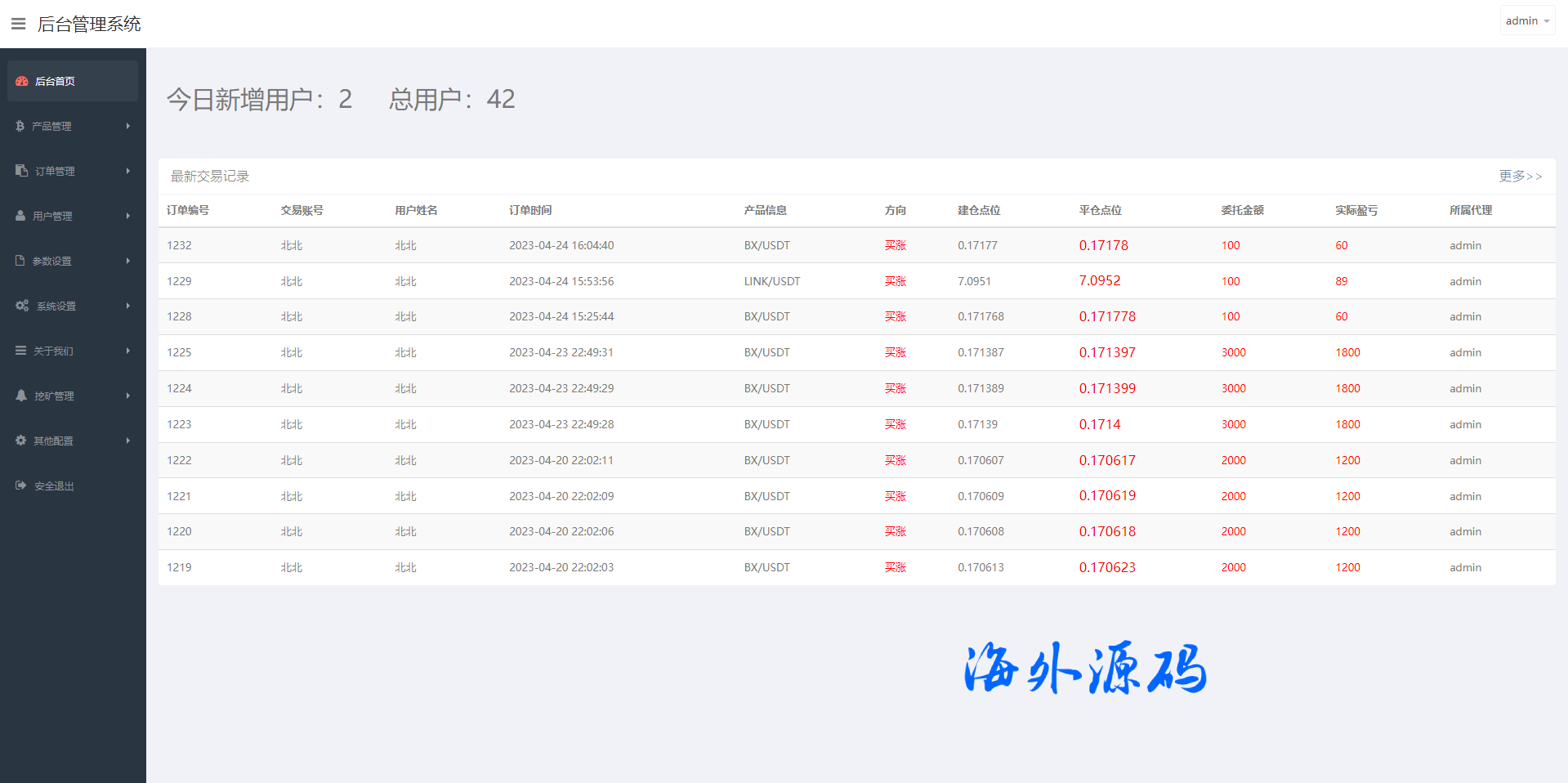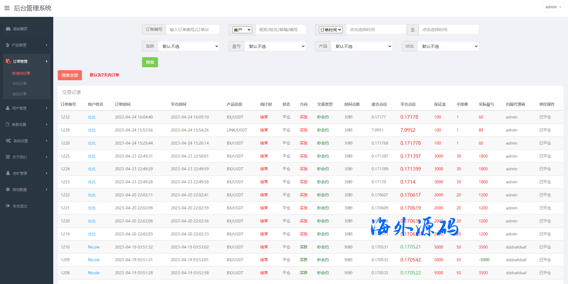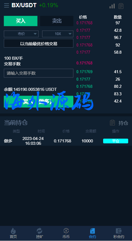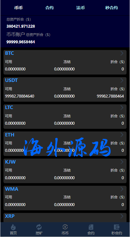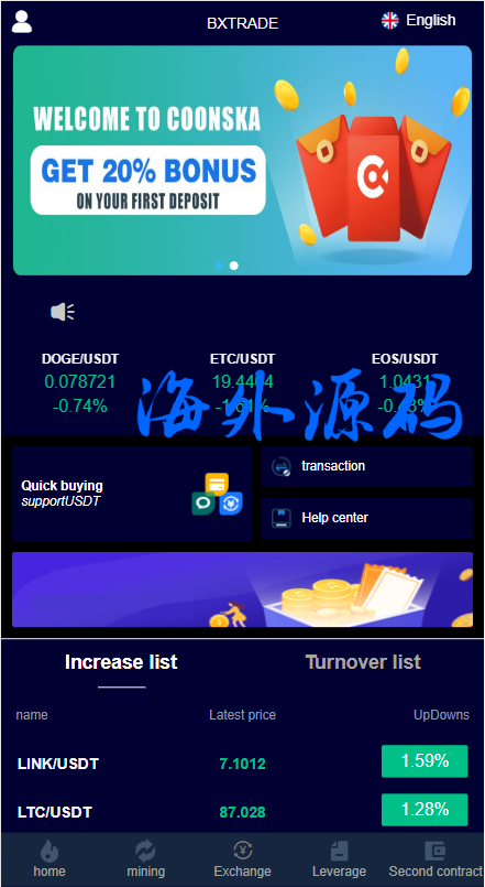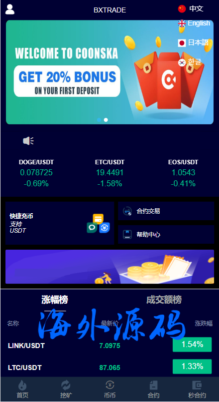 系统支持币币交易、合约交易、秒合约交易、质押挖矿、实名认证、邀请推广、客服系统等功能