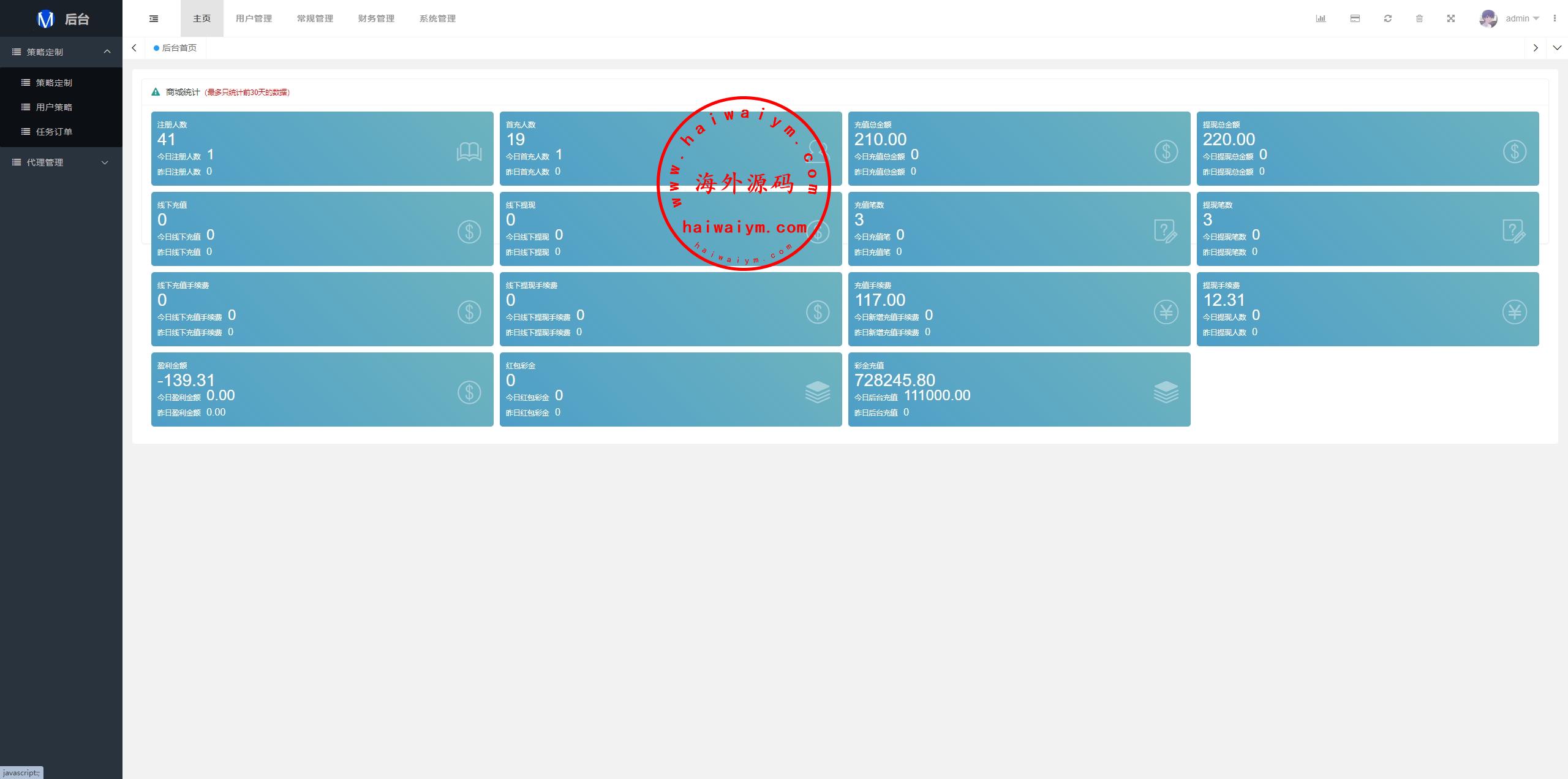 系统支持策略配置,后台共享代理后台独立,系统基本符合市场需求,单独的代理后台等功能