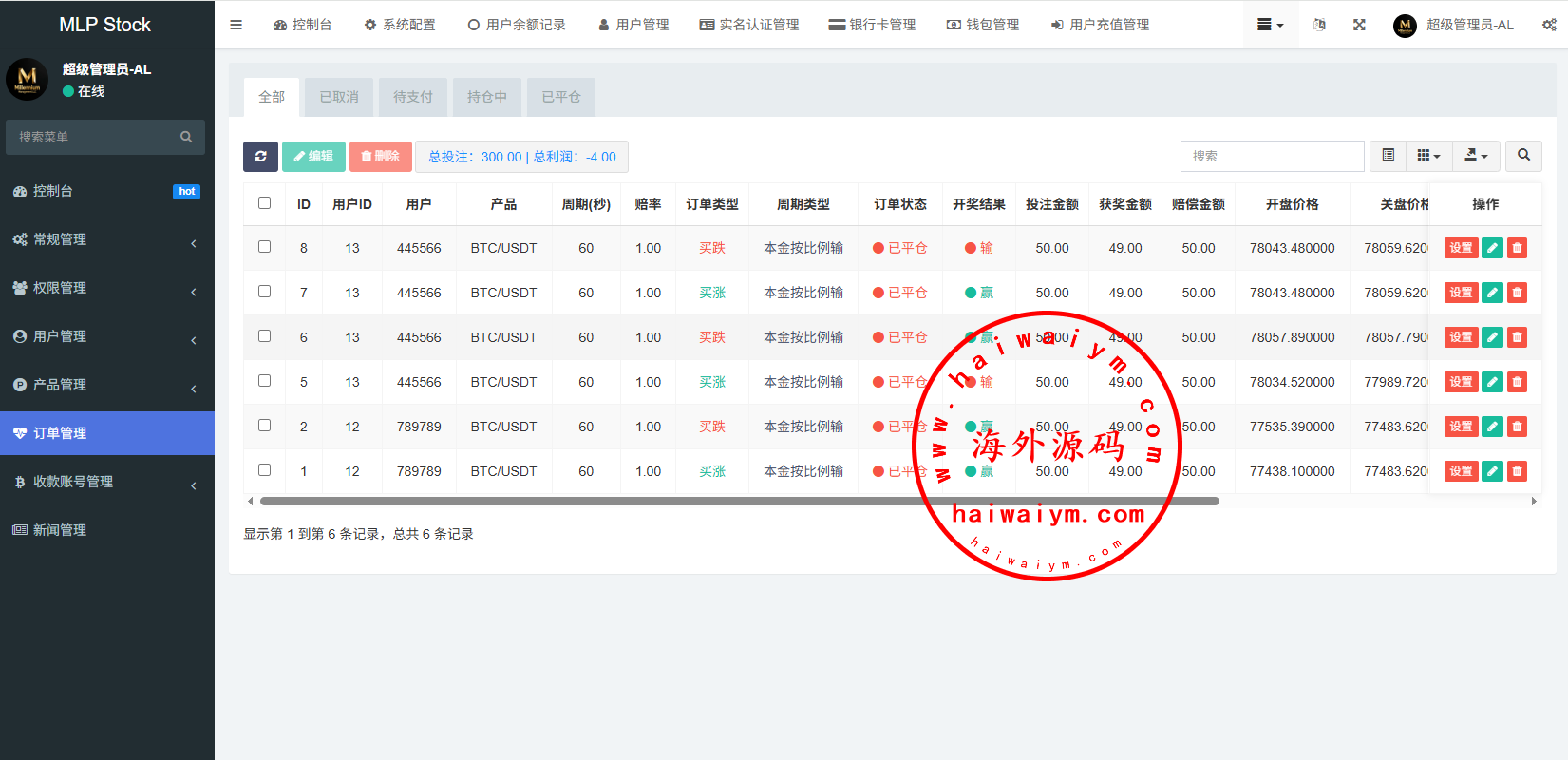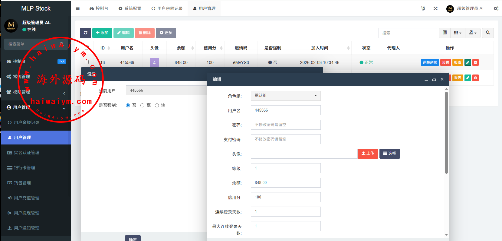 系统功能:信用分,实名认证,银行卡usdt充值提现,用户单控,订单控制等功能