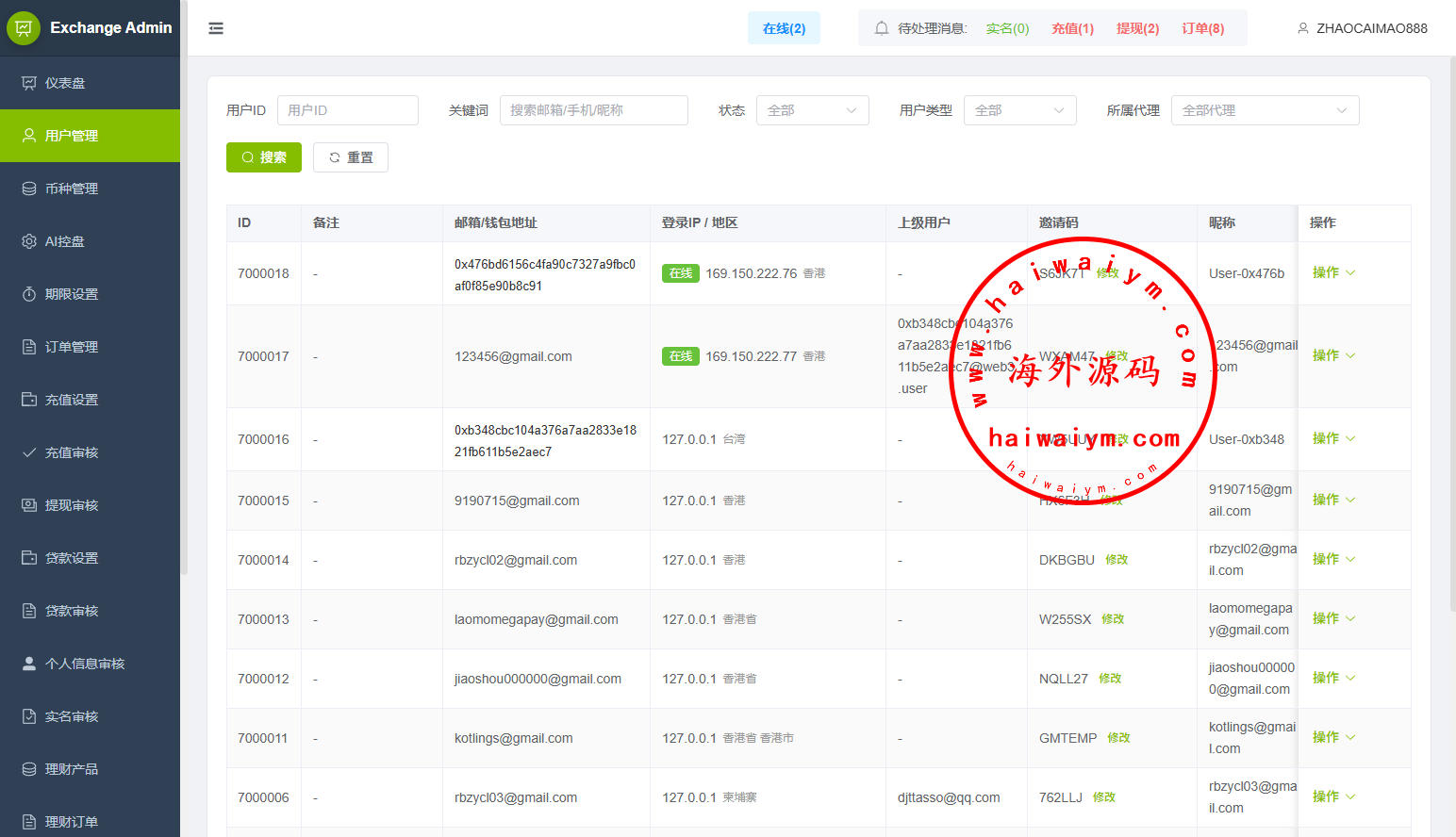 功能支持:合约,期权,贷款,理财,实名认证,权限代理,AI控盘等功能