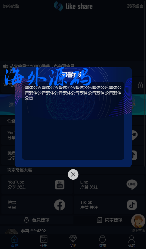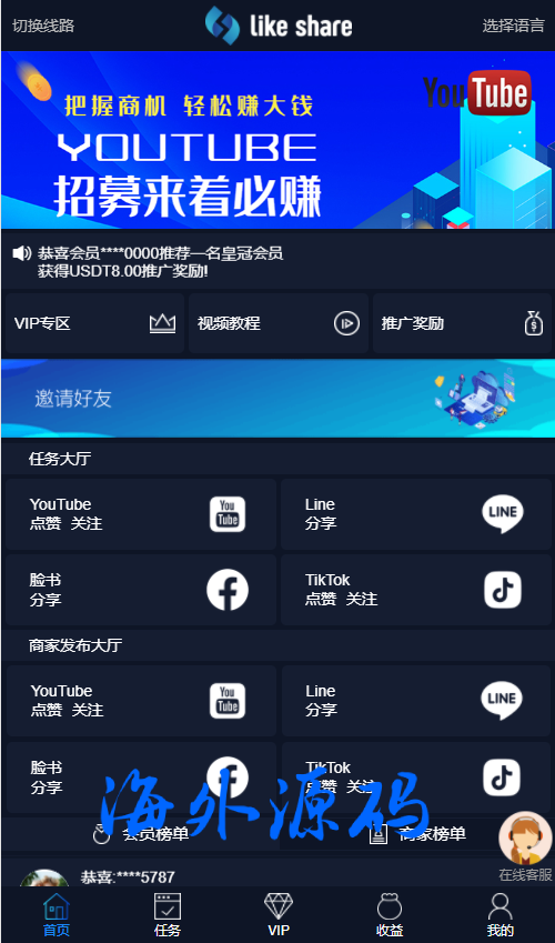 前端VUE多语言点赞任务系统/海外tiktok点赞平台源码