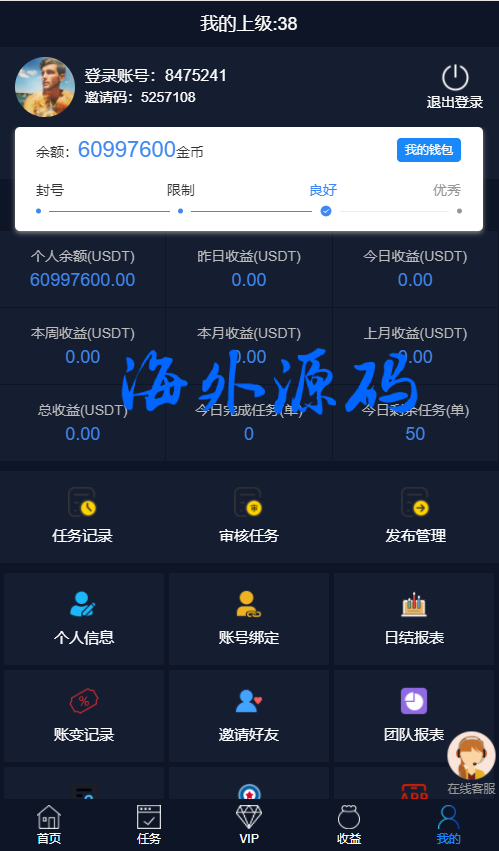 前台:首页可领取脸书tiktok等点赞关注任务!任务等级分为七种,每种等级领取的任务数量各不同。三级分销,没级代理各不同。可查看个人信誉度。