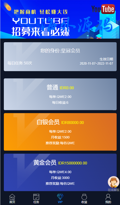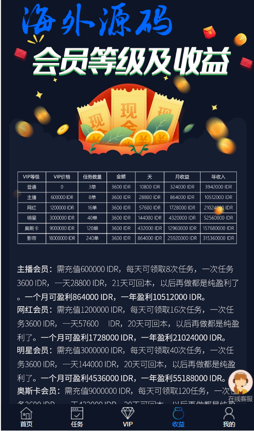 后台:可自定义设置自己的网站域名,客服qq,app名字等等、余额宝理财,财务明细等等!